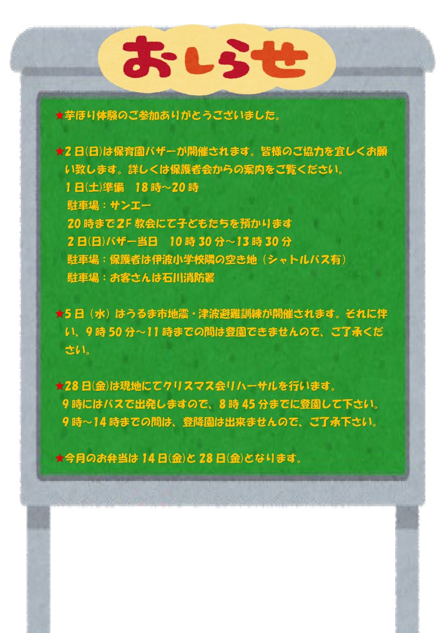 2日(日) 保護者会主催バザー 3日(月) 文化の日・休園 5日(水) うるま市防災訓練 13日(木) お誕生日会10:00~ 17日(月) 職場訪問 ※消防・警察 20日(木) 火災避難訓練 21日(金) クリスマス会リハーサル(園) 24日(月) 振替休日・休園 28日(金) クリスマス会リハーサル(現地)・お弁当